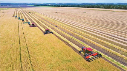 實施鄉(xiāng)村振興戰(zhàn)略,必須把確保重要農產品特別是糧食供給作為首要任務,把提高農業(yè)綜合生產能力放在更加突出的位置,把“藏糧于地、藏糧于技”真正落實到位。圖為2022年8月17日,大型秋收機械在內蒙古呼倫貝爾農墾牙克石農牧場有限公司第四連(隊)集群割曬作業(yè)。人民圖片王國印/攝