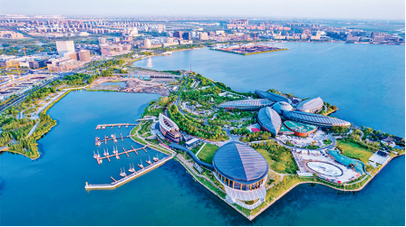 構(gòu)建新發(fā)展格局是開放的國內(nèi)國際雙循環(huán),我國堅定不移擴大對外開放,對外開放廣度和深度得到全面拓展。圖為上海自貿(mào)區(qū)臨港新片區(qū)滴水湖畔,多個重點項目如雨后春筍般拔地而起,面貌日新月異。中新社發(fā)鐘鑫旺/攝