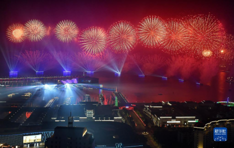 這是2018年6月9日晚在青島舉行的《有朋自遠(yuǎn)方來(lái)》燈光焰火藝術(shù)表演。2018年6月9日至10日,上海合作組織成員國(guó)元首理事會(huì)第十八次會(huì)議在青島召開(kāi)。新華社記者李紫恒攝