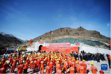 這是2016年2月27日在烏茲別克斯坦“安格連-帕普”鐵路卡姆奇克隧道出口拍攝的全隧貫通儀式現(xiàn)場(chǎng)。新華社記者沙達(dá)提攝