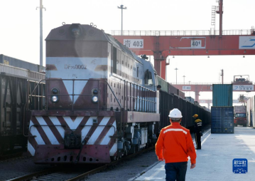 一列搭載輪胎、汽車(chē)配件、電子元件等貨物的“齊魯號(hào)”中亞班列即將發(fā)車(chē)駛出位于青島的中國(guó)-上合組織地方經(jīng)貿(mào)合作示范區(qū)青島多式聯(lián)運(yùn)中心(2020年11月9日攝)。新華社記者李紫恒攝