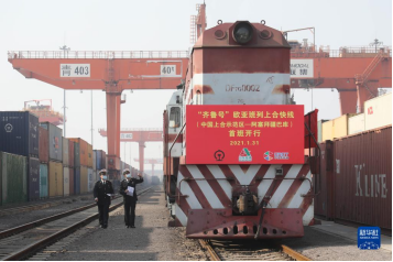 膠州海關(guān)關(guān)員對(duì)“齊魯號(hào)”歐亞班列上合快線(中國(guó)上合示范區(qū)——阿塞拜疆巴庫(kù))線路首班列車(chē)進(jìn)行檢查(2021年1月31日攝)。新華社發(fā)(解豪攝)