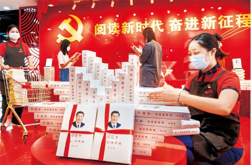 在全黨全社會喜迎黨的二十大勝利召開之際,《習近平談治國理政》第四卷出版發(fā)行。圖為2022年7月3日,重慶市渝中區(qū)重慶書城黨建讀物專區(qū),工作人員正在專架上陳列《習近平談治國理政》第四卷。重慶日報記者張錦輝/攝
