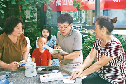 近日,山東省煙臺市組織開展《習近平談治國理政》第四卷微宣講活動。圖為2022年9月1日,煙臺市福山區(qū)高疃鎮(zhèn)渡口村村民聆聽宣講員分享《習近平談治國理政》第四卷學習體會。山東省委宣傳部供圖