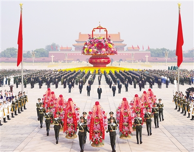 10時整,向人民英雄敬獻花籃儀式開始。軍樂團奏響《義勇軍進行曲》,全場齊聲高唱中華人民共和國國歌。