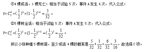 例1:植樹(shù)節(jié)期間,某單位購(gòu)進(jìn)一批樹(shù)苗,在林場(chǎng)工人的指導(dǎo)下組織員工植樹(shù)造林。假設(shè)樹(shù)苗的成活率為50%,那么,該單位職工小張種植5棵樹(shù)苗,至少成活4棵的概率是多少?( )