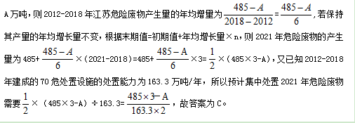 若江蘇危險廢物產(chǎn)生量保持2012-2018年年均增量不變,那么以2012-2018年建成的70座危險廢物集中處置設(shè)施的處置能力,預(yù)計集中處置2021年危險廢物需多少年?(假設(shè)2012年江蘇危險廢物產(chǎn)生量為A萬噸)( )