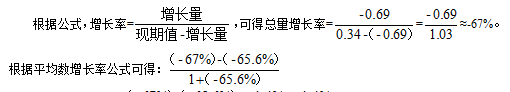 2.代入公式:由材料可知“2020年前三季度,B市鄉(xiāng)村旅游實現(xiàn)收入0.34億元,與上年同期相比減少0.69億元;接待游客與上年同期相比下降65.6%”。其中鄉(xiāng)村旅游實現(xiàn)收入為總量,總量增長率未知,接待游客人次為份數(shù),份數(shù)增長率為-65.6%。