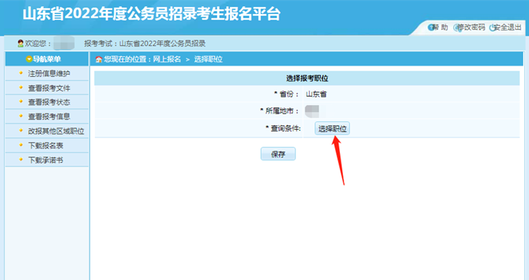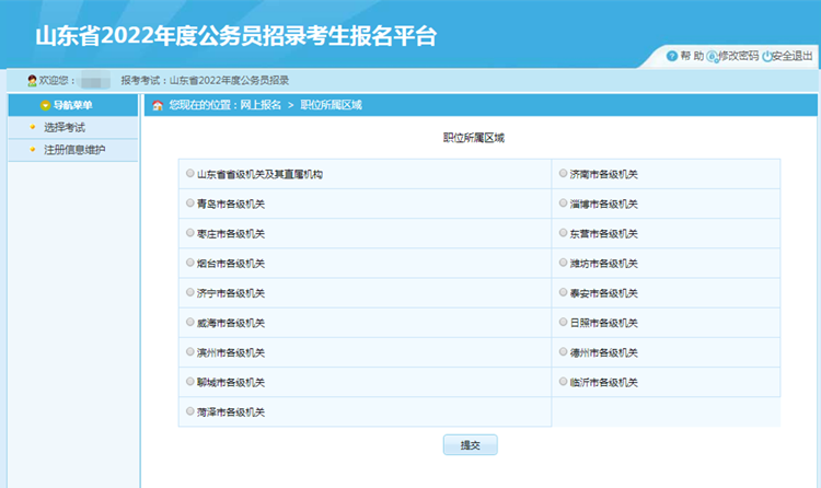 選中【山東省2022年度公務員招錄】,點擊后進入選擇職位所屬地市: