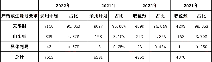 如,2022山東省考在戶籍門檻的設(shè)置上依然相當(dāng)寬松,有95.05%的名額、94.64%的職位沒(méi)有戶籍要求,全國(guó)各地的考生只要符合相關(guān)條件都可以報(bào)名。為更多考生提供了更多的機(jī)會(huì)。