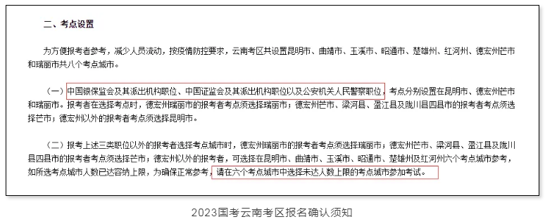 一般考區(qū)會(huì)發(fā)布報(bào)名確認(rèn)須知,要仔細(xì)查看,比如2023國(guó)考云南考區(qū)報(bào)名確認(rèn)須知:共設(shè)置昆明市、曲靖市、玉溪市、昭通市、楚雄州、紅河州、德宏州芒市和瑞麗市共八個(gè)考點(diǎn)城市。其中,還具體介紹了部分職位必須選指定考點(diǎn)。如下: