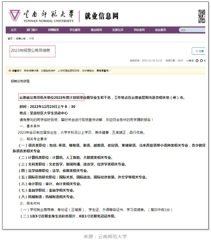 近日,云南師范大學發(fā)布2023省考宣講會消息:云南省公務(wù)員機關(guān)單位2023年度計劃招錄應(yīng)屆畢業(yè)生若干名,工作地點在云南省昆明市及各相關(guān)地(州)市。具體如下:
