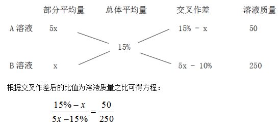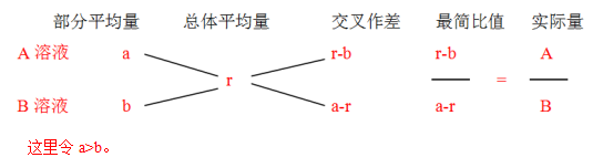 難度較低的題目只需要通過以上幾個公式列方程即可求解,那么在考試中如果遇到溶液混合這類難以下手的問題,同學(xué)們還可以采用十字交叉法來快速求解。