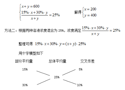 通過這個例子,我們不難發(fā)現(xiàn),方程法在列式及求解的過程中,計算量相對較大,而通過十字交叉法簡單畫圖就可以快速得出結(jié)果,列式步驟較少、計算量較少。因此,同學(xué)們可以在今后做題時采用十字交叉法快速解決此類問題。