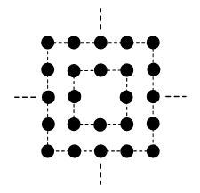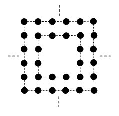 正中間有四個人的正方形陣列掏去中間若干層,如下圖所示為掏去中間一層,任意一層每邊人數(shù)n為偶數(shù)。
