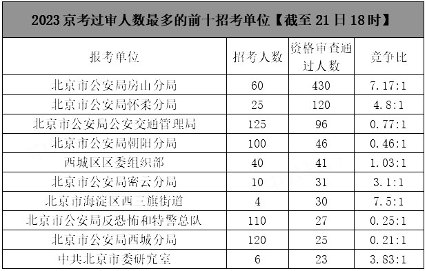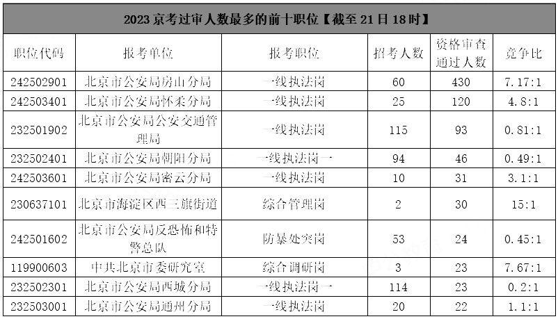 截至21日18時,2023京考過審人數(shù)最多的職位是北京市公安局房山分局一線執(zhí)法崗這一職位,職位代碼為【242502901】,共招錄60人,已有430人過審,平均競爭比為7.17:1。過審人數(shù)最多的前十職位主要集中在北京市公安局房山分局、北京市公安局朝陽分局和中共北京市委研究室等單位,其中有八個職位均來自北京市公安局,具體見下: