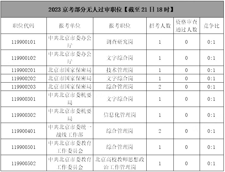 截至21日18時,2023京考無人過審職位還有1944個,占總職位數(shù)的86.8%。和去年同期無人過審職位持平。還沒有報(bào)名的考生,可考慮一下無人過審職位,避開熱門崗位。因無人過審職位過多,以下僅展現(xiàn)部分無人過審職位,僅供大家參考:
