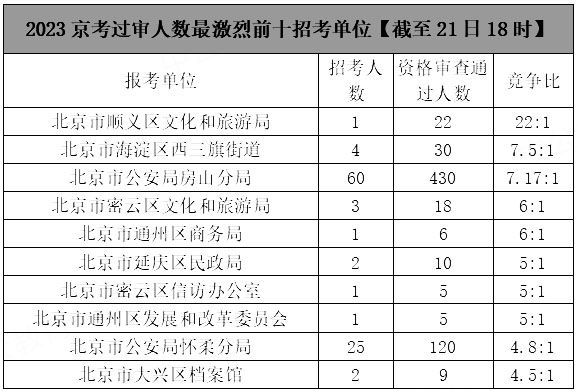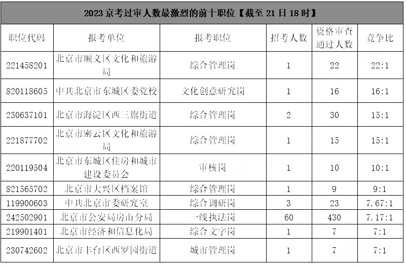 從競爭比來講,2023京考競爭最激烈的職位是北京市順義區(qū)文化和旅游局綜合管理崗這一職位,職位代碼為【221458201】,競爭比已達(dá)22:1,成為人氣最高的職位。去年報(bào)名首日18時,競爭最激烈的職位是北京市平谷區(qū)地震局綜合管理崗職位,競爭比為39:1。過審人數(shù)最激烈的前十職位具體如下: