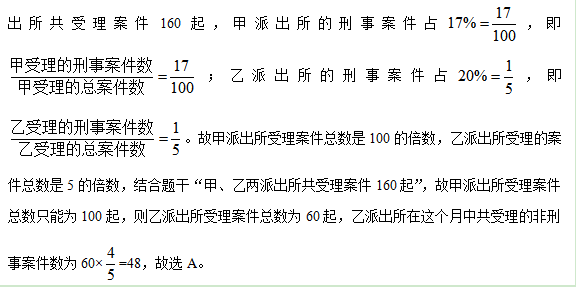 例2:兩個派出所某月內共受理案件160起,其中甲派出所受理的案件中有17%是刑事案件,乙派出所受理的案件中有20%是刑事案件,問乙派出所在這個月中共受理多少起非刑事案件?( )
