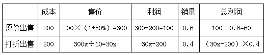 可知按期望總利潤為100×1=100元,而實際總利潤為100×(1-18%)=82元,故60+(30x-200)×0.4=82,解得x=8.5,即余下的桌椅是打八五折出售的,此題選C。