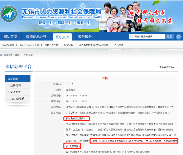 有考生在無錫人社局官網(wǎng)進(jìn)行了咨詢,官方回復(fù)稱:目前沒有延期通知。同時建議考生為避免7天內(nèi)旅居市出現(xiàn)本土聚集性疫情影響參加考試,考生應(yīng)提前抵錫,且盡量做到考前7天不離錫。