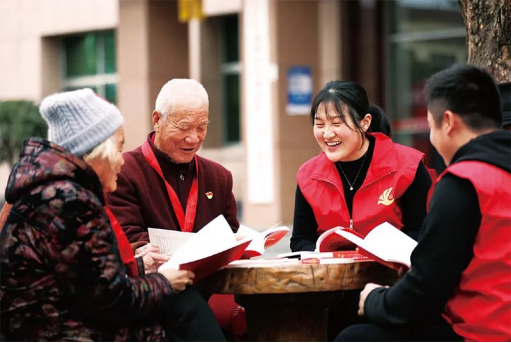 圖為2022年11月18日,山東省臨沂市郯城縣郯城街道“90后”青年黨員志愿者與龍泉社區(qū)“40后”老黨員一起學習黨的二十大精神。人民圖片張春雷/攝