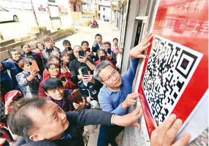 圖為2022年11月13日,江西省鄱陽縣雙港鎮(zhèn)黨員干部將宣講黨的二十大精神的二維碼貼在村頭,吸引不少村民前來掃碼學習了解有關(guān)知識。中新社發(fā)卓忠偉/攝