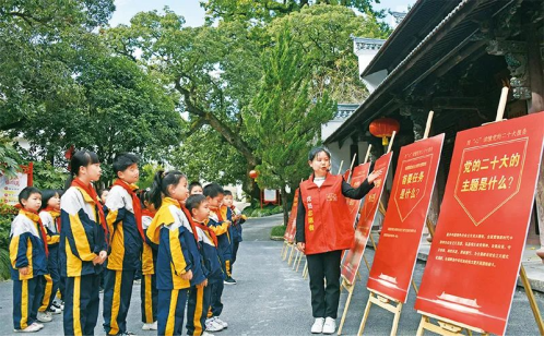 圖為2022年10月25日,浙江省臺州市上張鄉(xiāng)中心小學的學生在中共仙居縣委舊址紀念館學習黨的二十大精神。人民視覺王華斌/攝