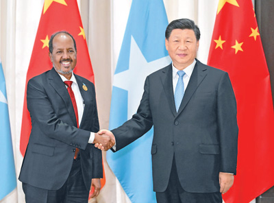 習近平指出,中方一貫支持索方維護主權、尊嚴和領土完整,長期向非盟駐索馬里特派團提供支持,積極推動國際社會支持和幫助索馬里。中方愿同索方維護政治互信,在涉及彼此核心利益和重大關切問題上相互理解、相互支持,推動中索關系不斷邁上新臺階,共同維護發(fā)展中國家正當權益。中方愿為索馬里重建和經濟社會發(fā)展提供力所能及的幫助,鼓勵兩國企業(yè)探討在農業(yè)、漁業(yè)、衛(wèi)生等領域合作。中方支持索政府提升維穩(wěn)打恐能力。