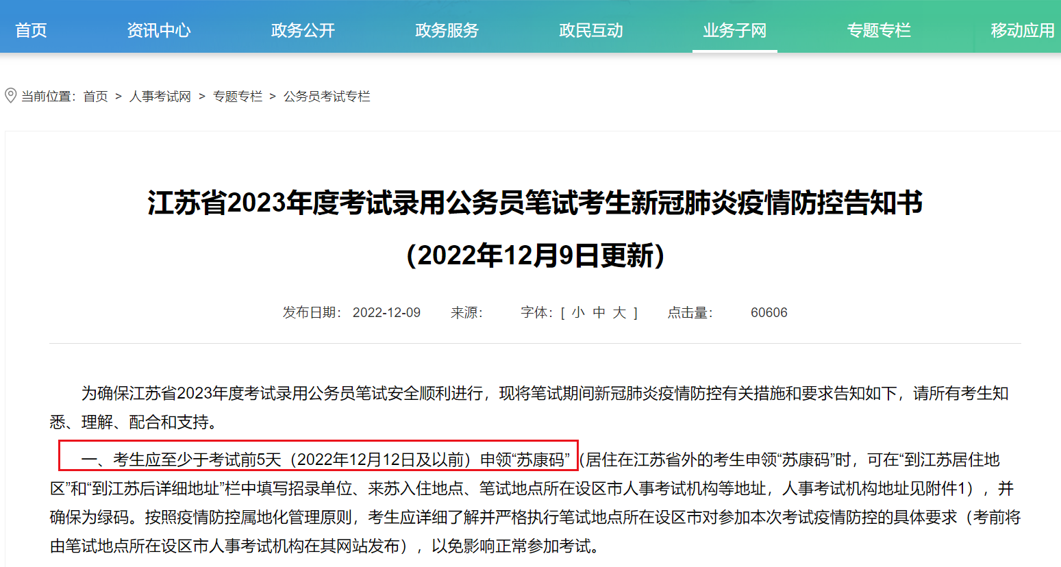 根據(jù)周五江蘇人社局以及各地市人事考試網(wǎng)發(fā)布的疫情防控告知書以及補(bǔ)充告知書,明確要求考生應(yīng)考生應(yīng)至少于考試前5天(2022年12月12日及以前)申領(lǐng)“蘇康碼”并確保為綠碼。
