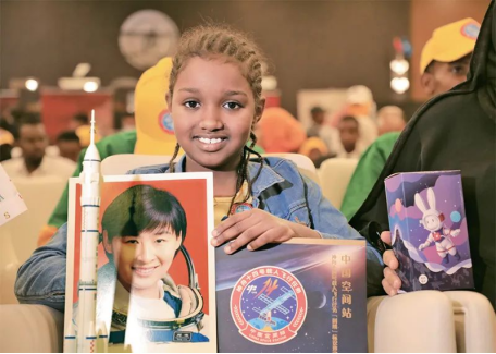 近年來,越來越多的中非合作項(xiàng)目落地生根,務(wù)實(shí)合作取得累累碩果。圖為2022年9月6日,在索馬里首都摩加迪沙的“天宮對話”活動索馬里分會場,當(dāng)?shù)貙W(xué)生展示活動紀(jì)念品。來自埃塞俄比亞、埃及等非洲8國的青少年當(dāng)日通過網(wǎng)絡(luò)視頻與正在中國空間站執(zhí)行任務(wù)的神舟十四號航天員進(jìn)行“天宮對話”活動。新華社發(fā)扎卡里亞/攝