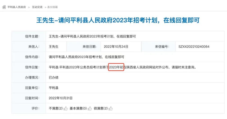 2023年公務(wù)員考試新消息,平利縣人民政府回復(fù)網(wǎng)友問答,指出“平利縣2023年公務(wù)員招錄計(jì)劃將在年初公布”。