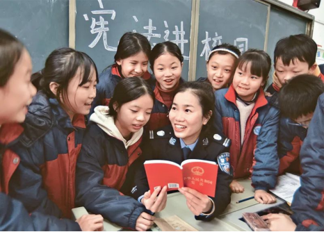 在習(xí)近平法治思想指引下,新時(shí)代十年我們黨全面加強(qiáng)憲法實(shí)施和監(jiān)督,設(shè)立了全國人大憲法和法律委員會(huì),建立憲法宣誓制度,設(shè)立國家憲法日。圖為2022年12月4日,第九個(gè)“國家憲法日”活動(dòng)當(dāng)天,湖南省郴州市嘉禾縣司法局開展“憲法知識(shí)進(jìn)校園”活動(dòng),司法工作人員在博雅學(xué)校向?qū)W生講解憲法知識(shí)。人民圖片供圖