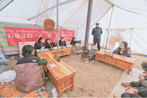 人民性是習(xí)近平法治思想最鮮明的品格。習(xí)近平法治思想提出努力讓人民群眾在每一項(xiàng)法律制度、每一個(gè)執(zhí)法決定、每一宗司法案件中都感受到公平正義。圖為2022年1月10日,四川省石渠縣“正義雪蓮”女子審判團(tuán)隊(duì)成員來到呷依鄉(xiāng),在一頂帳篷布置成的“帳篷法庭”里,通過巡回審判開庭審理一起離婚案。新華社記者沈伯韓/攝