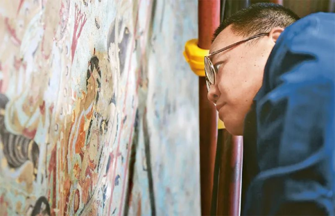 加大文物和文化遺產(chǎn)保護(hù)力度,提高傳承實(shí)踐能力。圖為2022年4月19日,在莫高窟第231窟,敦煌研究院文物保護(hù)技術(shù)服務(wù)中心的壁畫(huà)修復(fù)工作者在修復(fù)出現(xiàn)病害的壁畫(huà)。新華社記者杜哲宇/攝