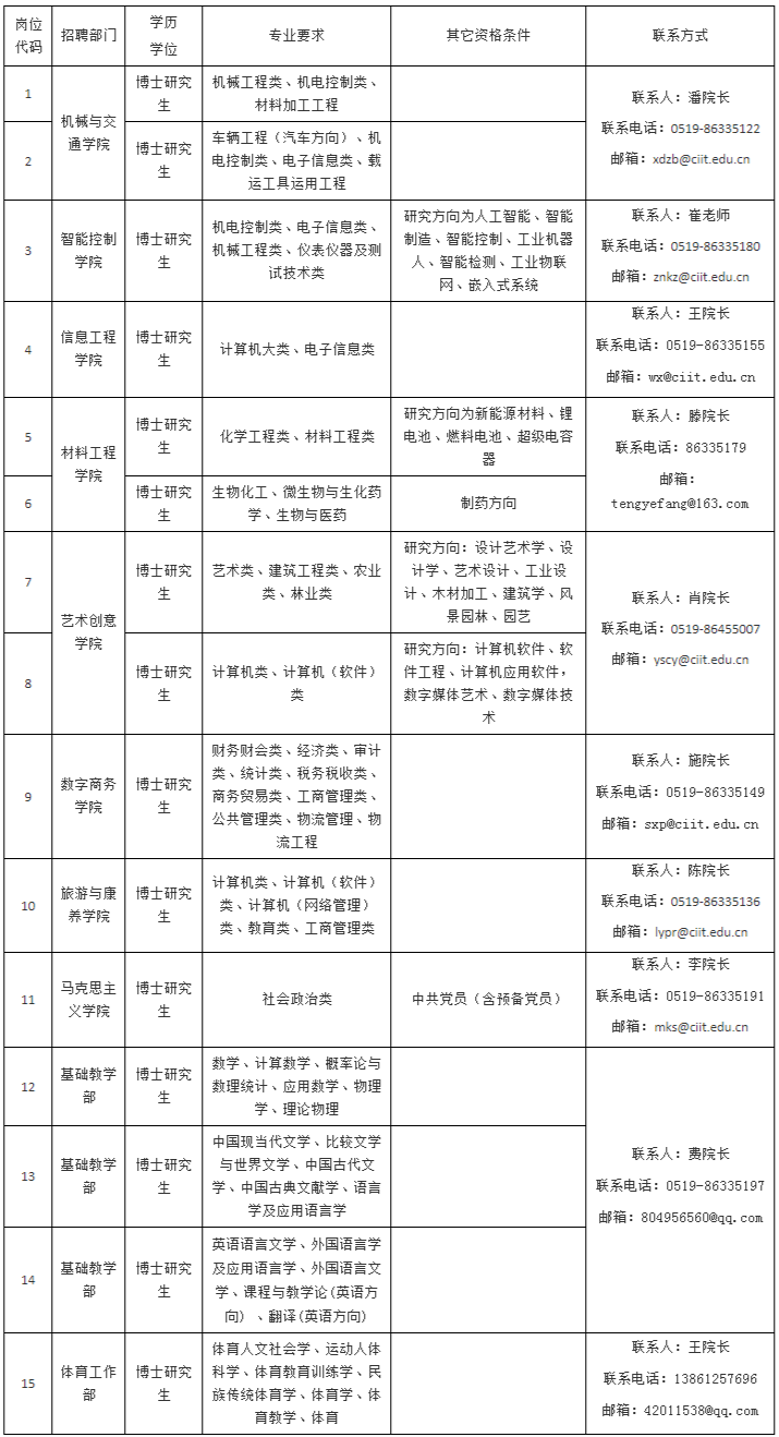 請應(yīng)聘者填寫《常州工業(yè)職業(yè)技術(shù)學(xué)院公開招聘人員報(bào)名表》(見附件),并發(fā)送至各招聘部門郵箱或人事處郵箱zhaopin@ciit.edu.cn。發(fā)送郵件主題格式:崗位代碼+招聘部門+姓名+專業(yè)+學(xué)歷學(xué)位。