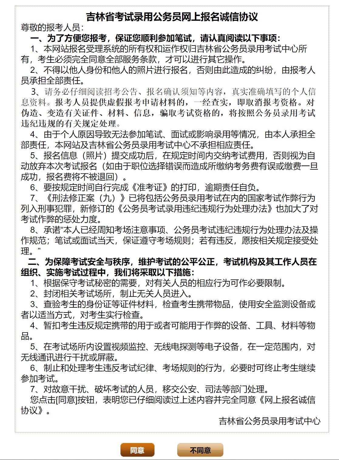 3、考生認(rèn)真閱讀‘吉林省考試錄用公務(wù)員考生誠信須知’(如圖1-3)后,點擊‘同意’即可進(jìn)入登錄及注冊頁面,如果點擊‘不同意’則返回到圖1-1頁面。