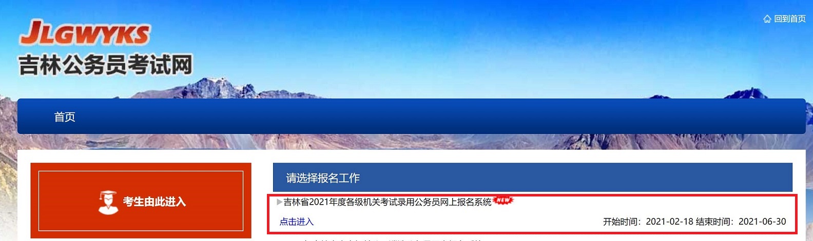 1、報名考生進(jìn)入該網(wǎng)站后,點擊頁面右上角紅色的‘考生由此進(jìn)入’,進(jìn)入報名工作選擇界面,如圖1-1: