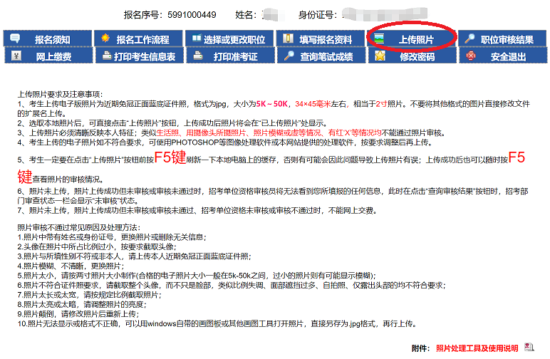 1、點擊‘照片上傳’進(jìn)入照片上傳界面,上傳照片前請詳細(xì)閱讀‘上傳照片要求及注意事項’如圖4-1。