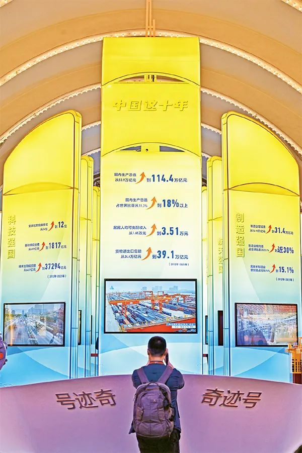 2022年10月8日,觀眾在“奮進新時代”主題成就展中央綜合展區(qū)內(nèi)拍攝中國經(jīng)濟“奇跡號”巨輪模型。新華社記者李鑫/攝