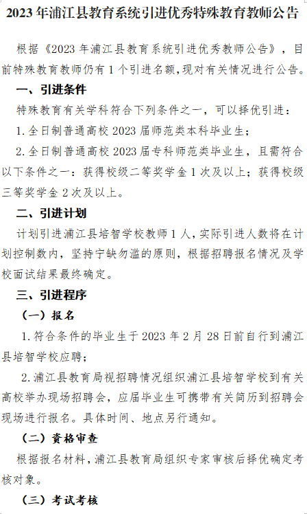 2023年浙江金華浦江縣教育系統(tǒng)引進優(yōu)秀特殊教育教師公告