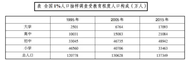 【例2】2005年全國1%人口抽樣調(diào)查主要數(shù)據(jù)公報顯示,同2000年第五次全國人口普查相比,2005年具有大學(xué)教育程度的人口增加2193萬人;具有高中教育程度的人口增加974萬人具有初中教育程度的人口增加3746萬人;具有小學(xué)教育程度的人口減少4485萬人。2015年全國1%人口抽樣調(diào)查主要數(shù)據(jù)公報顯示,同2010年第六次全國人口普查相比,2015年每10萬人中具有大學(xué)教育程度人口由8930人上升為12445人;具有高中教育程度人口由14032人上升為15350人;具有初中教育程度人口由38788人下降為35633人;具有小學(xué)教育程度人口由26779人下降為24356人。