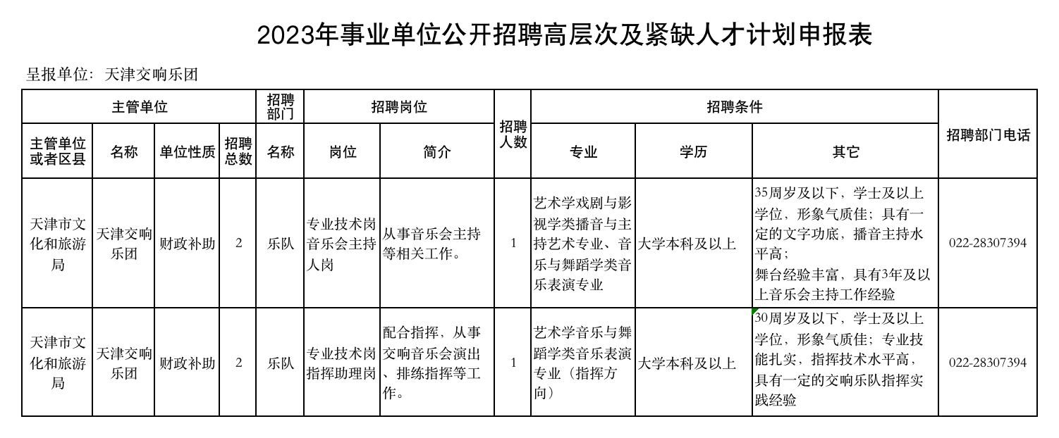 天津交響樂團(tuán)2023年事業(yè)單位公開招聘高層次及緊缺人才方案