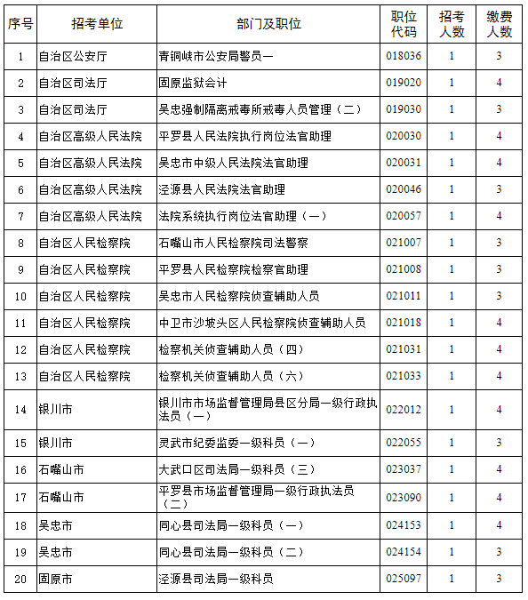 2023年全區(qū)考試錄用公務(wù)員網(wǎng)上報(bào)名、資格初審及繳費(fèi)工作結(jié)束后,有部分職位未達(dá)到筆試開考比例。根據(jù)《寧夏回族自治區(qū)2023年考試錄用公務(wù)員公告》中“筆試開考比例(職位有效報(bào)名人數(shù)與招錄名額之比)一般為5: 1。定向招考職位、專業(yè)性較強(qiáng)、生源較少的特殊職位以及艱苦邊遠(yuǎn)地區(qū)招考職位筆試開考比例可降至3:1,公安系統(tǒng)法醫(yī)、監(jiān)獄機(jī)關(guān)獄醫(yī)等專業(yè)性強(qiáng)的職位筆試開考比例可降至2:1。達(dá)不到筆試開考比例的職位,減少招考名額或取消招考計(jì)劃。招考計(jì)劃取消的,報(bào)考該職位的考生可改報(bào)其他符合條件的職位”的規(guī)定,經(jīng)研究,取消、減少部分職位招考名額,降低部分職位筆試開考比例。具體如下: