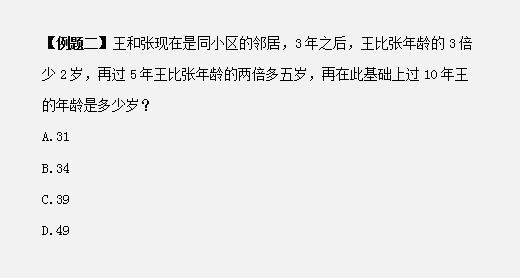 第二步,設3年后,張的年齡為x歲,則王的年齡為3x-2,再過5年,張為x+5,王為3x+3,根據(jù)王比張的2倍多5歲列方程:3x+3=2(x+5)+5,解得x=12,此時王的年齡為39歲,在此基礎上過10年,王的年齡是39+10=49歲。