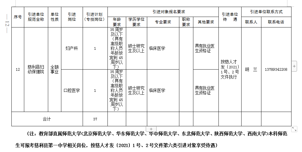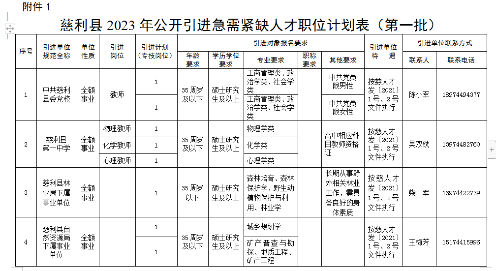 本次人才引進計劃共37名。詳見《慈利縣2023年公開引進急需緊缺人才職位計劃表(第一批)》(附件1)。