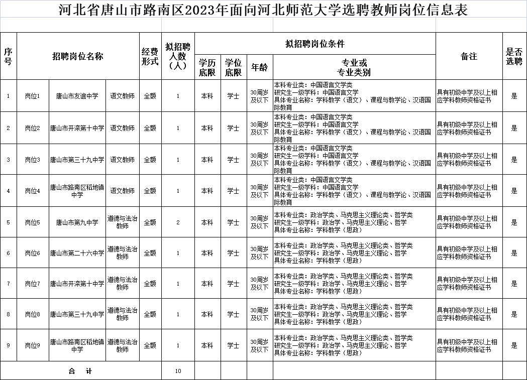 本次選聘事業(yè)單位編制教師共10名,語文教師4名、道德與法治教師6名。具體選聘人數(shù)和崗位條件詳見《河北省唐山市路南區(qū)2023年面向河北師范大學(xué)選聘教師崗位信息表》。
