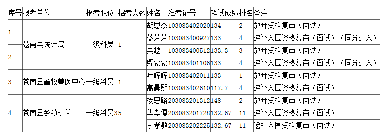 2023年浙江公務(wù)員考試溫州蒼南縣遞補(bǔ)入圍資格復(fù)審人員名單