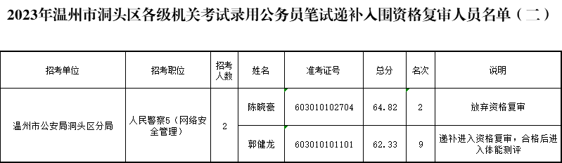 2023年溫州市洞頭區(qū)考試錄用公務(wù)員筆試遞補(bǔ)進(jìn)入資格復(fù)審(體能測評)人員名單公示(二)