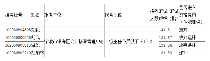 關(guān)于公布2023年鎮(zhèn)海區(qū)各級機關(guān)單位考試錄用公務(wù)員放棄資格復審(體能測評)及遞補人員名單的公告(二)